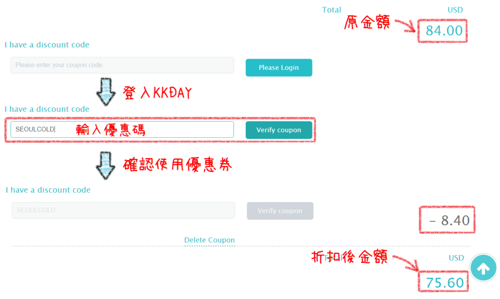 選購完產品,在結帳頁面可以輸入優惠碼,要使用優惠碼必須先登入KKDAY。